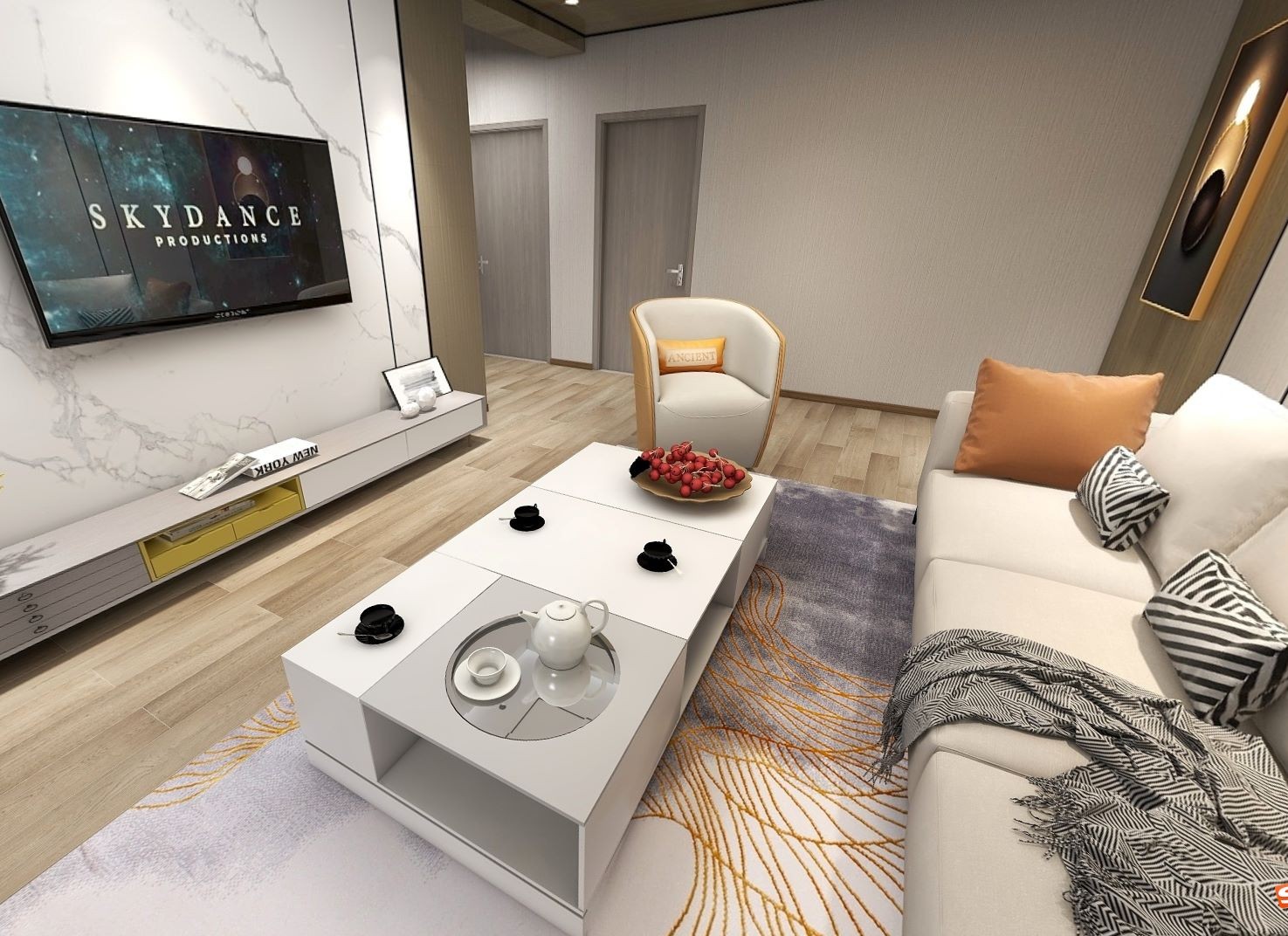 强烈的艺术视觉与立体感充斥整着个空间,客厅和阳台采光很好,硬装整体比较传统,电视背景墙为灰白搭配竹木纤维背景墙,电视上墙。整体较简约。