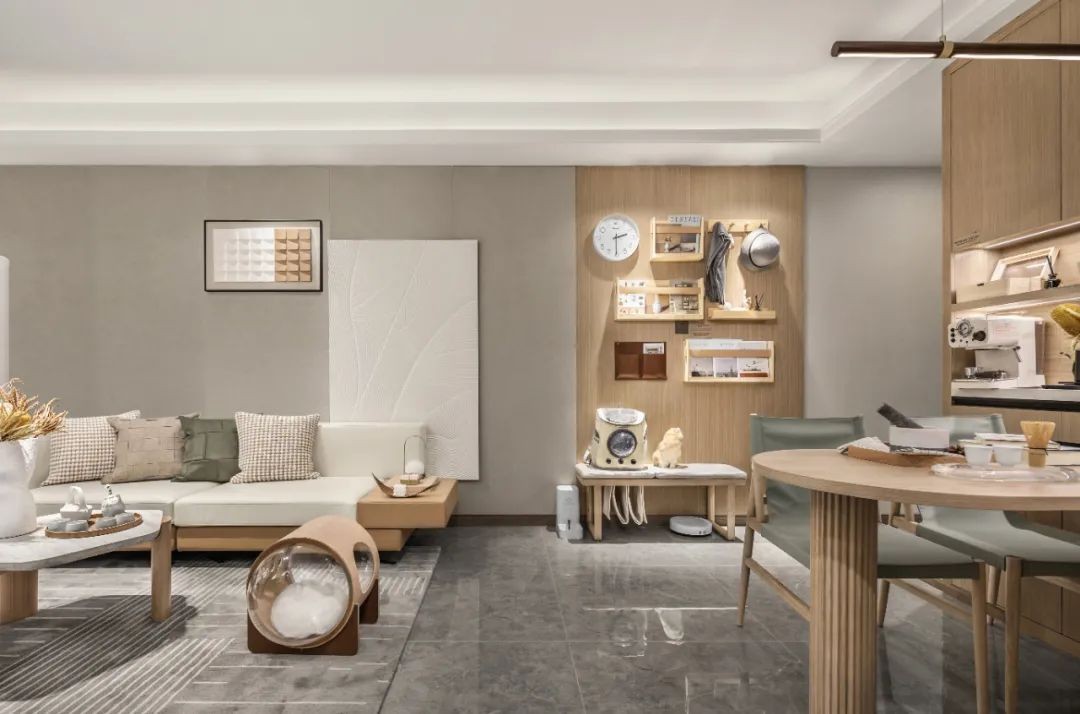 淡雅的灰调与原木的自然色系悄然碰触,和谐穿插在室内动线的视觉呈现中。遵循猫咪的视角,空间的“猫洞”元素、功能陈设、装饰艺术等凝结成有机的整体。