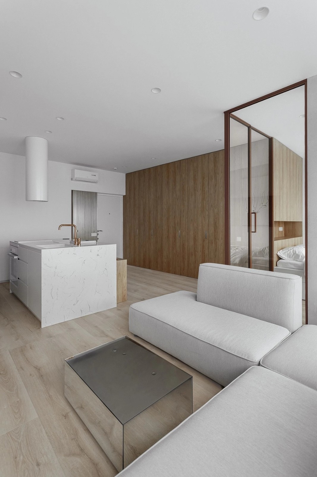 卧室通过透明隔断与生活空间分隔开来 木质的床头背景墙 和床底区域都可用做收纳 墙上的挂画增加了室内的艺术气息