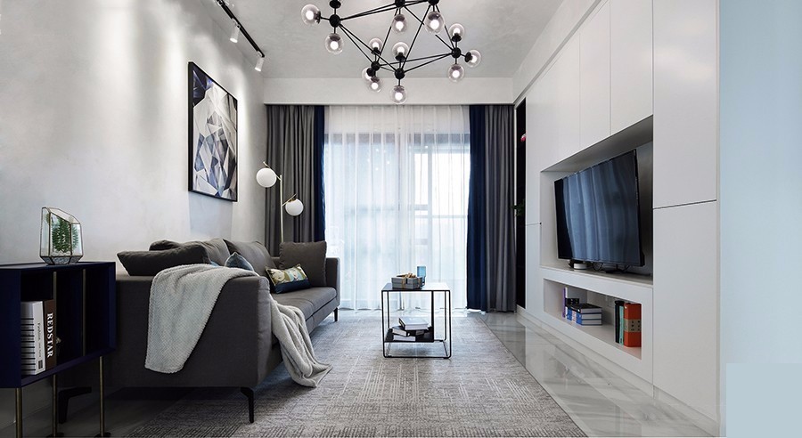 客厅整个地面铺设800灰砖,辅以黑色波导线,再搭配上深色家居,韵味十足。