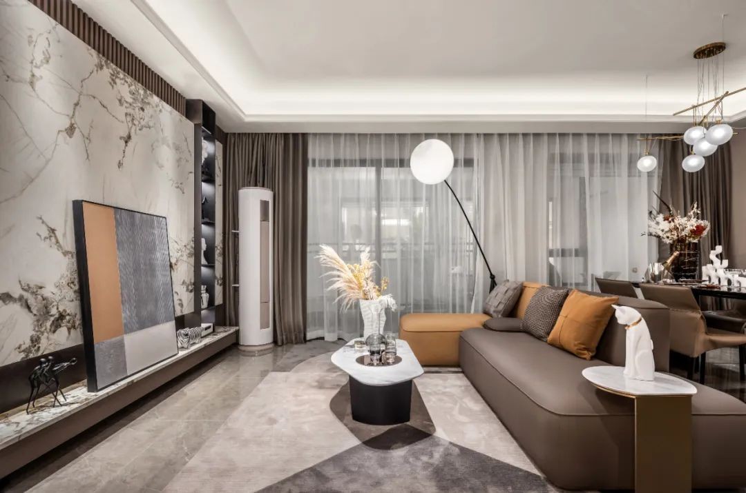 客厅采用咖色搭配橘色的皮质沙发,稳重又不失活跃