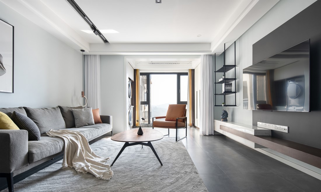 “一个空间中一定要有一个抓人眼球的色彩”。灰绿色墙面与浅灰色地毯覆盖客厅,创造出清醒柔和的视觉感,并用些许暖色调软装添入明亮色彩,带出空间轻快氛围。