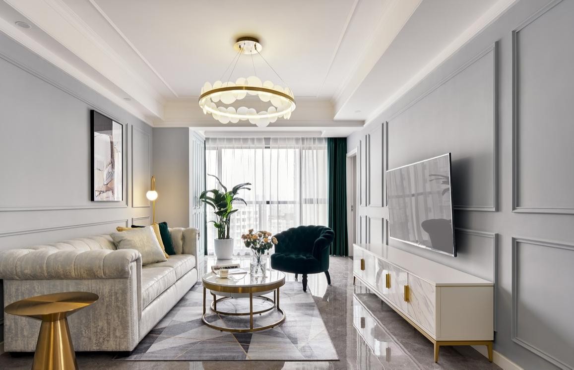L型厨房操作台面节约空间,大理石花纹地砖配上墙面线条造型让空间更具层次,同时拉伸视觉效果。金属灯具、餐椅的加入,让空间更显质感。主卧及多功能房均采用低饱和度的色彩搭配,空间优雅时尚又不失明亮清爽。
