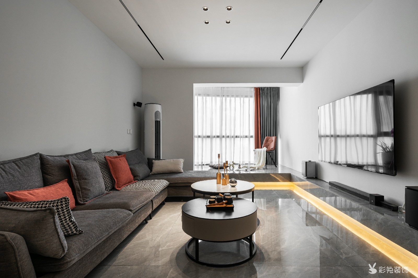 ▲ 将飘窗台延伸至客厅中央,正好替代了电视柜承担储物功能,好看又实用。