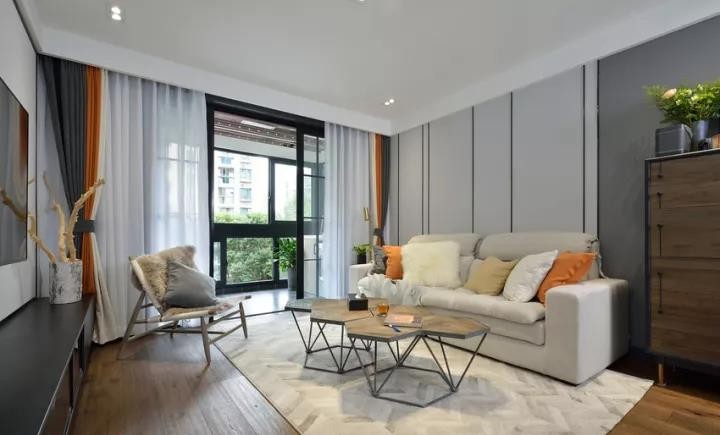 客厅的整体设计简约大方,通过冷灰和暖橘色搭配,色彩上形成了鲜明的对比,活跃了客厅的氛围。