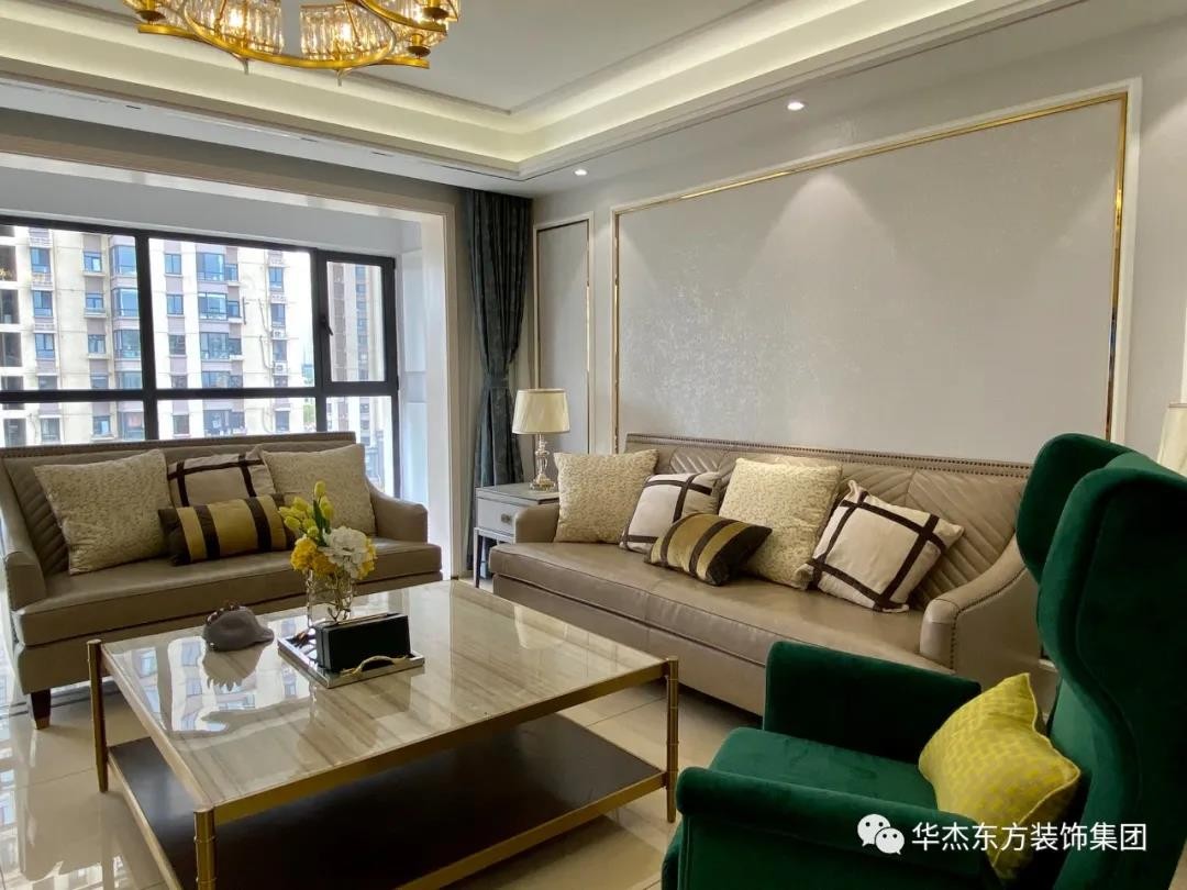 客厅以波打线、灯池、家具的合围之势,实现功能区域的划分。