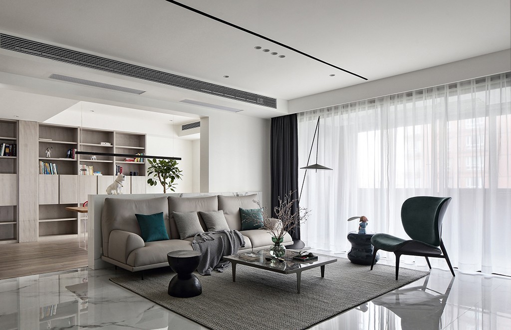 客厅的颜色以白色为主色调,简约的风格给人一种非常自然的平静感。大面积的落地窗,给这一部分空间提供了非常明亮的光线