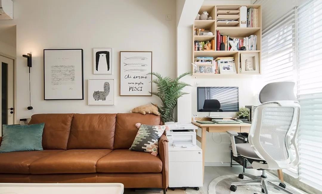 大面积白墙与简单装饰画搭配,增加空间明亮度以及设计感,柔软的皮质沙发在大面积白色与木色的空间里让人眼前一亮。开放式的空间让工作区与客厅也能产生良好的互动性。