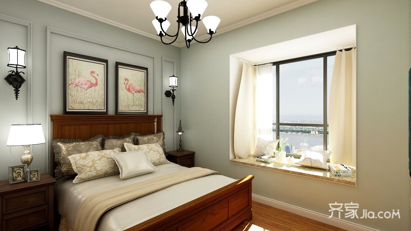 美式风格卧室,湖蓝色搭配石膏线造型背景墙,胡桃木家具