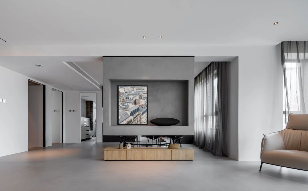 客厅、餐厅和开放式厨房被打通, 阳光透过落地窗肆意蔓延。 悬挂式电视墙在无形中 将客厅与餐厅分隔开来 拓展了物理边界 设计师在有界与无界之间 营造了独特的空间感和家庭符号