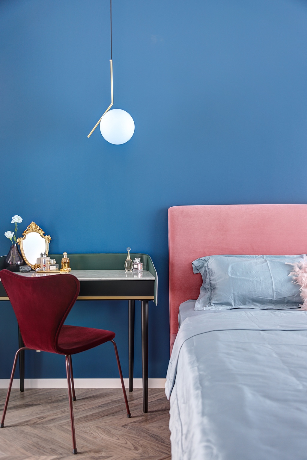 步入主卧,最令人拍案叫绝的是粉与蓝的碰撞!当低饱和度的烟粉色遇上浓烈明亮的蓝色,对比鲜明却又和谐融洽,展现出张扬的浪漫。
