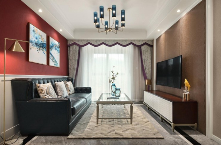 此整体色调温馨为主,选用朱砂红提色,让整个空间鲜活起来;在家装设计中,亮色适合小面积使用,多则不宜