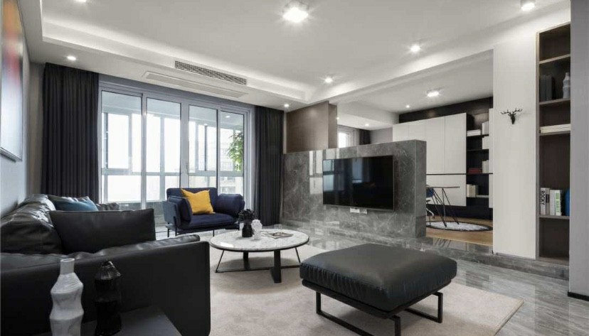 从这个角度看过去,客厅的简单、大气、纯粹一览无遗。落地窗让阳光暖暖的透进屋内,阳台上的绿植正生长的茂密。敲掉书房的非承重墙,取而代之的是大理石电视背景墙。区别于普通全墙壁的设计,这样的半壁构造从视觉上拉伸了空间,美感与功能性并存,令人眼前一亮。