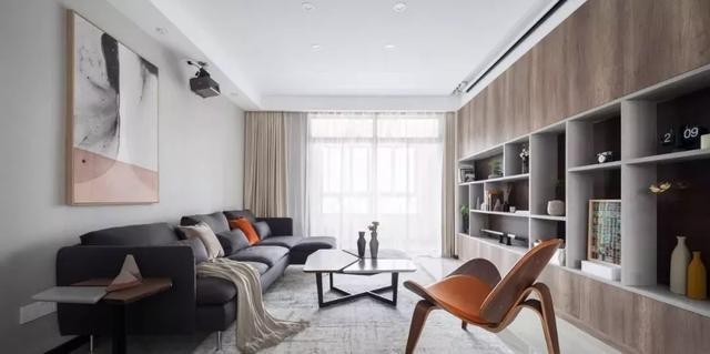 客厅简单的吊顶,无主灯设计,比较显高。灰白色为空间的主色调,搭配简约的家具,整个空间显得非常的明亮宽敞。