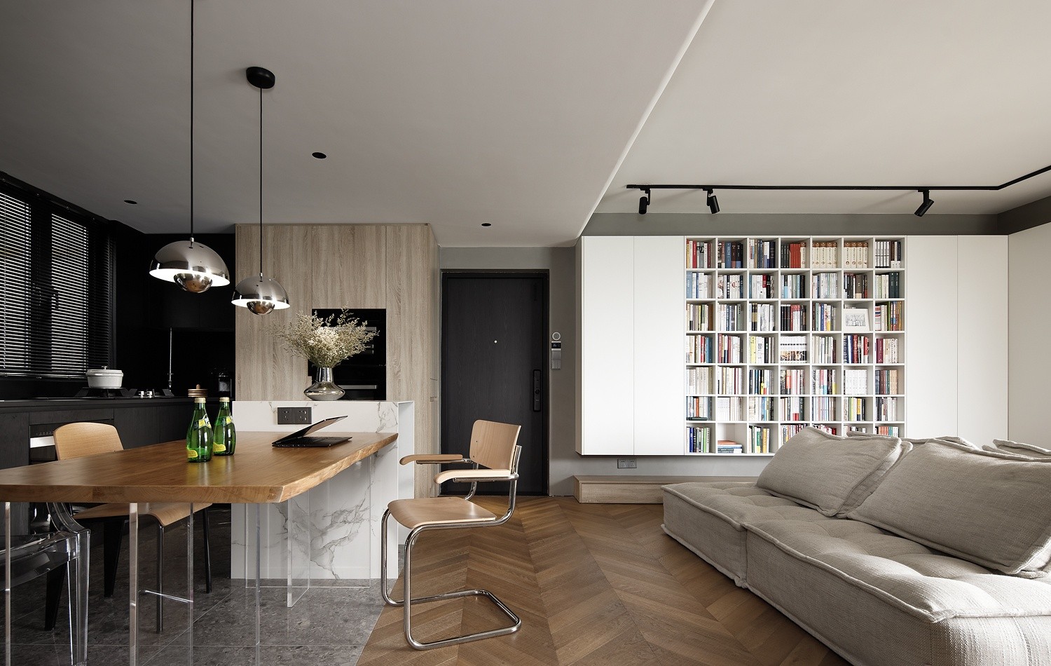 以温暖的木色搭配黑白灰作为整体基调,LDK一体化的设计,解放了原来分隔狭小的布局,并将书的元素结合其中,由此定义出居家空间,栖息着书、物件和人。