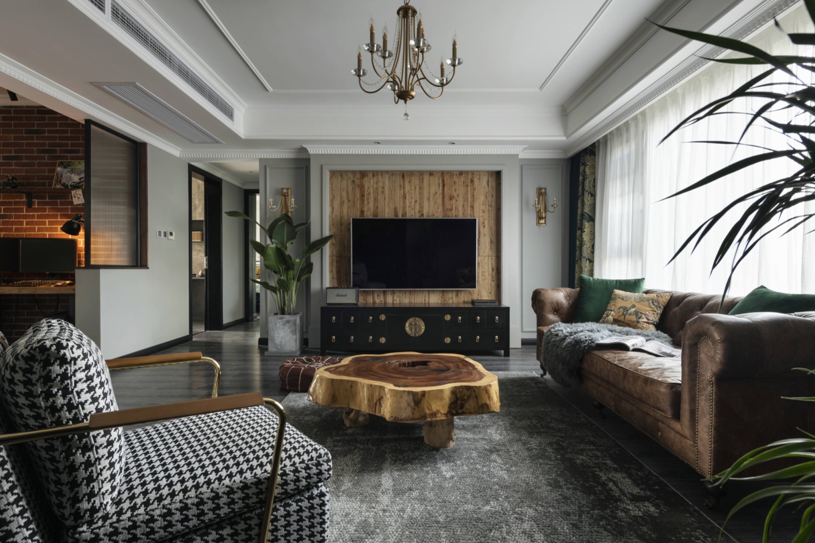 客餐厅延续暖色老木板元素,整个空间采用了质朴的棕色,红色同色系作为辅助色,墙面采主调,转换空间画面的同时,随着光影变化,让空间更具沉稳,过道处充满艺术气息的挂画,更给空间带来了艺术气息。
