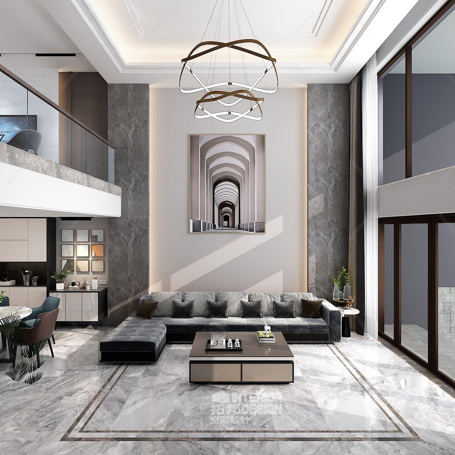 大厅近似矩形,空间一览无余,所有墙面都连成一片,原来两个不同尺度的窗户也被一条黑色的边线连成了一个整体,窗户之间的墙面涂成黑色用来挂画,窗户两侧的墙面为双曲线制成,无论平面立面均是正半圆,从而实现了视觉的完美流畅,另外家具的尺度选择也带了空间的开阔感。