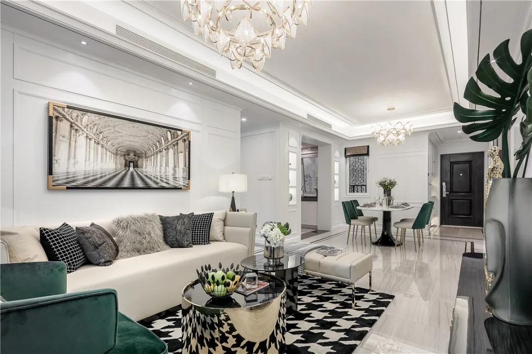 今天要跟大家来分享的这套新房装修案例是一套面积为119平米的新房,装修风格为轻奢混搭风。而其实,这套案例的装修还是很具有装修参考价值的,因为它的整体轻奢有范的感觉是通过软装颜色的搭配进行布置的,所以即使是全屋以白色为主基调,但也显得贵气十足,而这主要是因为运用了墨绿色进行点缀装扮。那下面我们就赶紧一起来看看详细的设计吧!