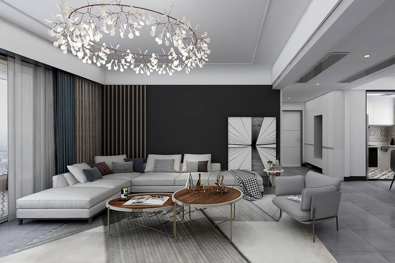 白色的布艺沙发,与黑色的背景墙相互辉映。棕色的精致茶几,让整个客厅看起来更加时尚、干净。