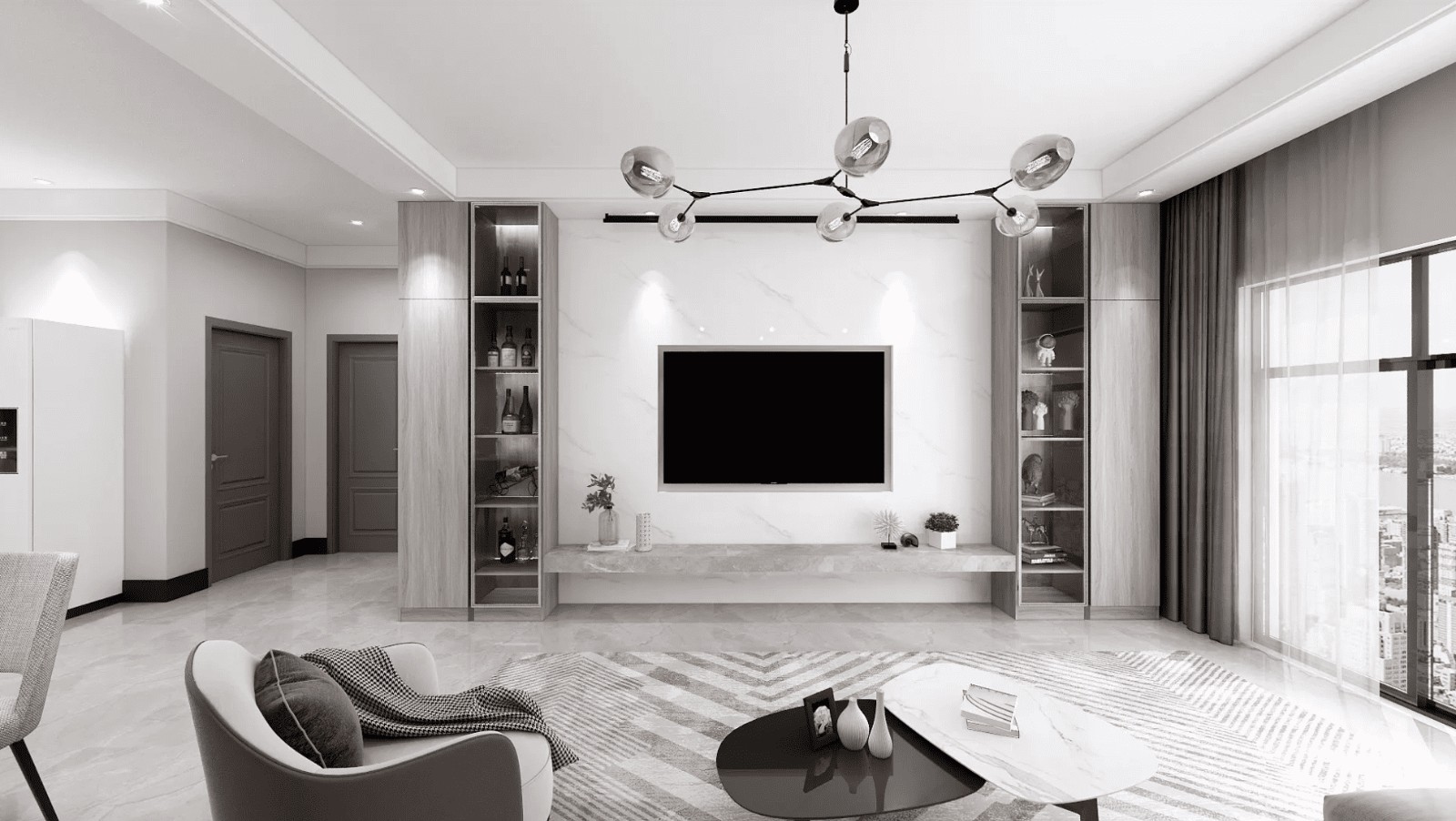 虽然整体是极简的格调,但是,该有的设计一个也没落下。卧室背景墙是白色岩板与电视背景遥相呼应,让原来平平无奇的墙面变得灵动许多。