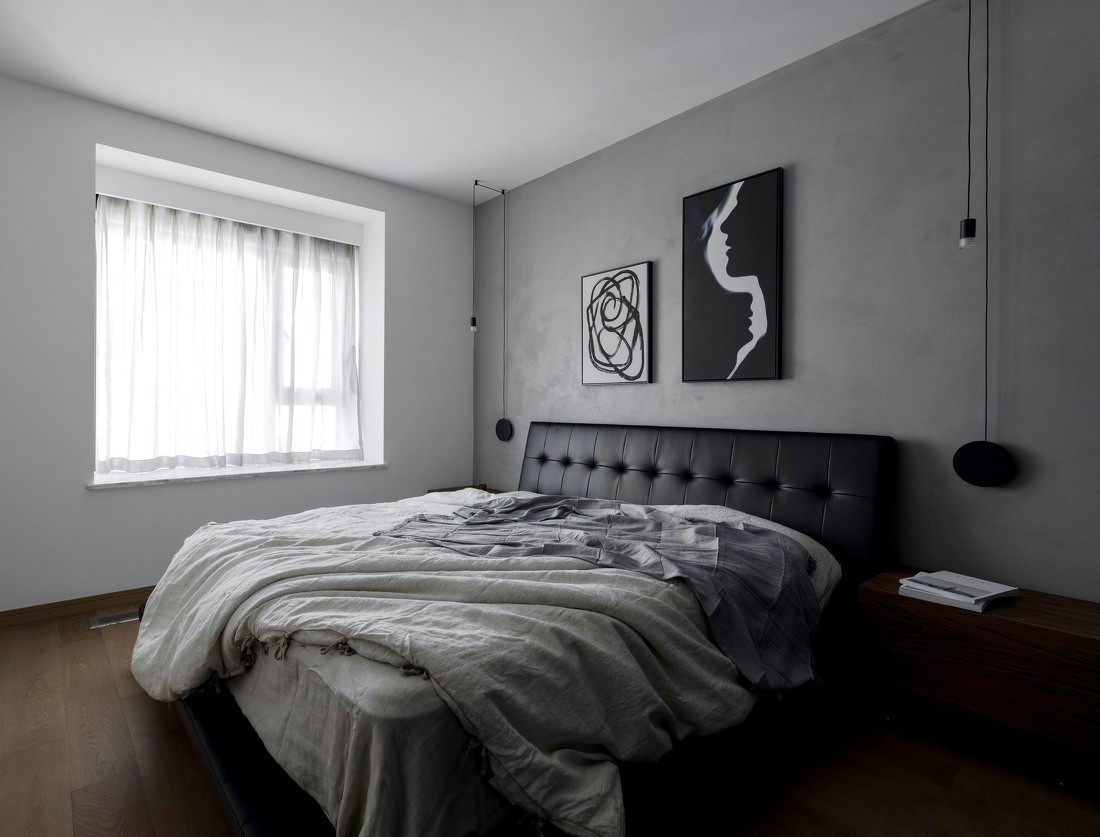 主卧并没有做为过多的加法设计,以简约装饰画和线性吊灯作为空间点缀,力求干净、简约,黑白灰的色调搭配给人一种纯粹、明朗的感觉,极具线条感的悬挂吊灯,更有立体和虚实感,为空间带来十足的活力。