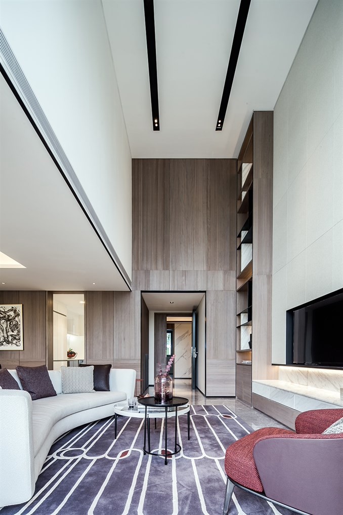 尽头处起居大厅中6.3米高的双层落地窗户将阳光与家的温度一起在空气中弥漫开来