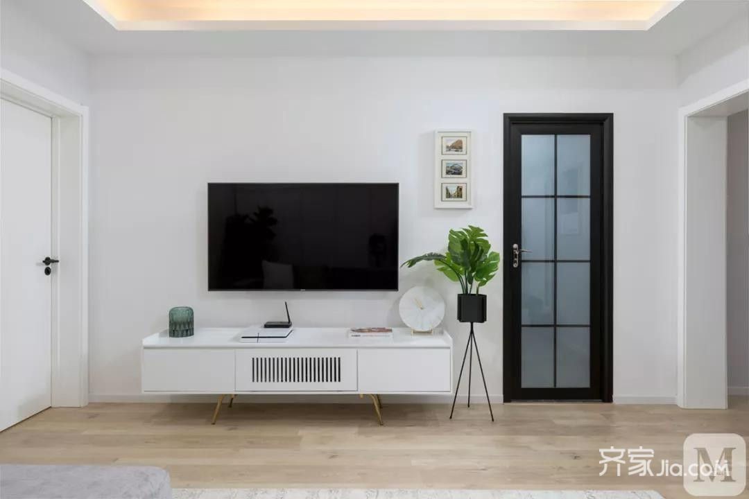 客厅空间不大,以大白墙为主,电视上墙搭配一个简易小脚电视柜,既简单又满足较低预算需要。