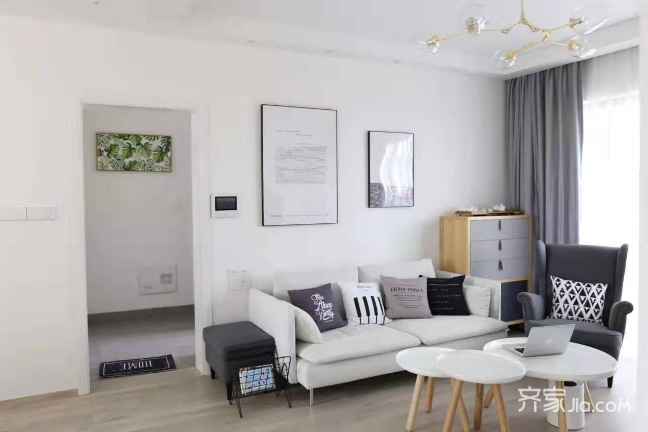 客厅大概14㎡,配色以白色和原木色为主,仅在窗帘和沙发区点缀了少量灰色。