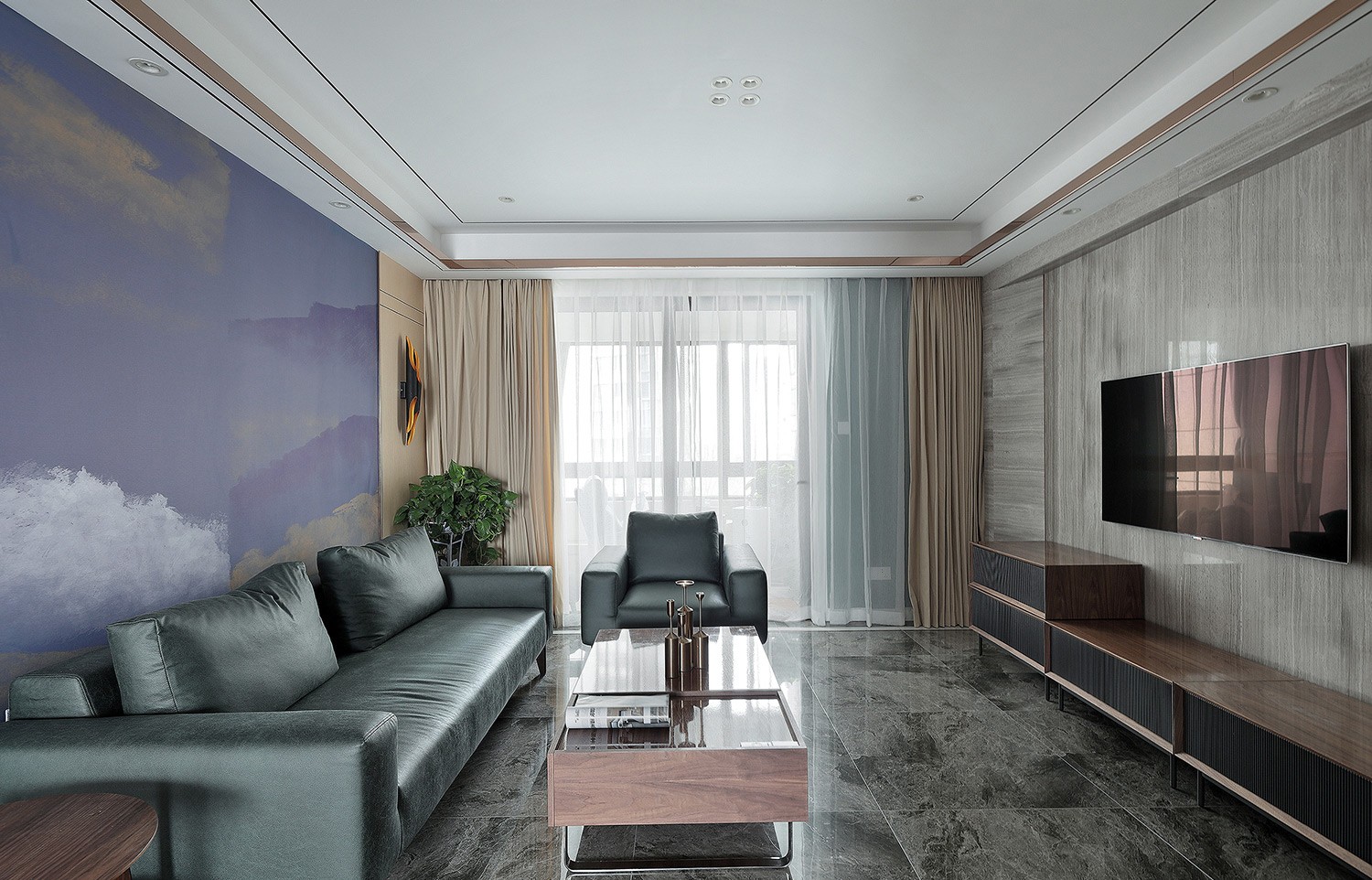 皮质沙发增加了空间的质感,电视柜的下方做镂空,便于卫生的清洁