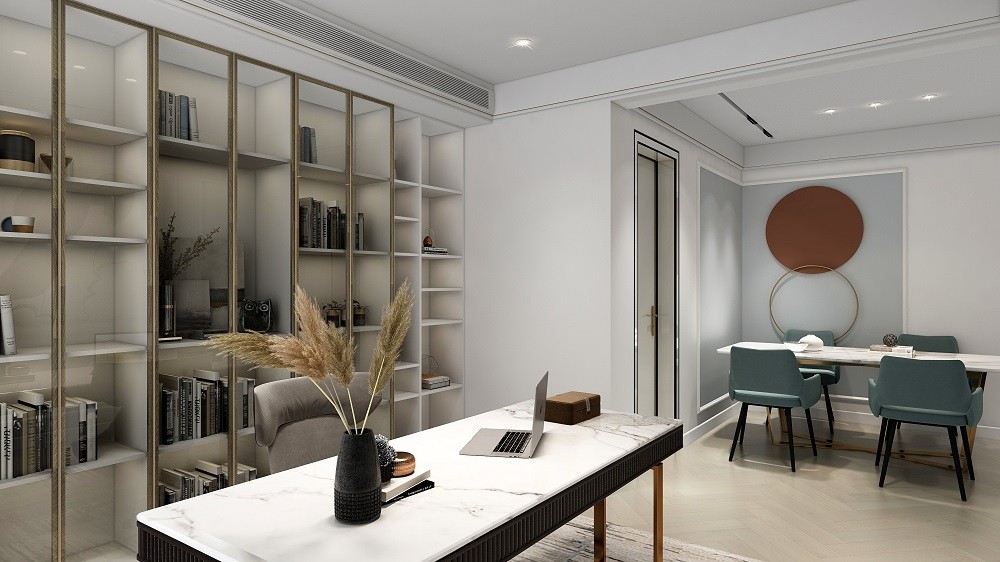 客厅改为书房,整面的书架,大大的书桌,通透的采光,既满足儿子日常学习,也可供主人公日常办公。