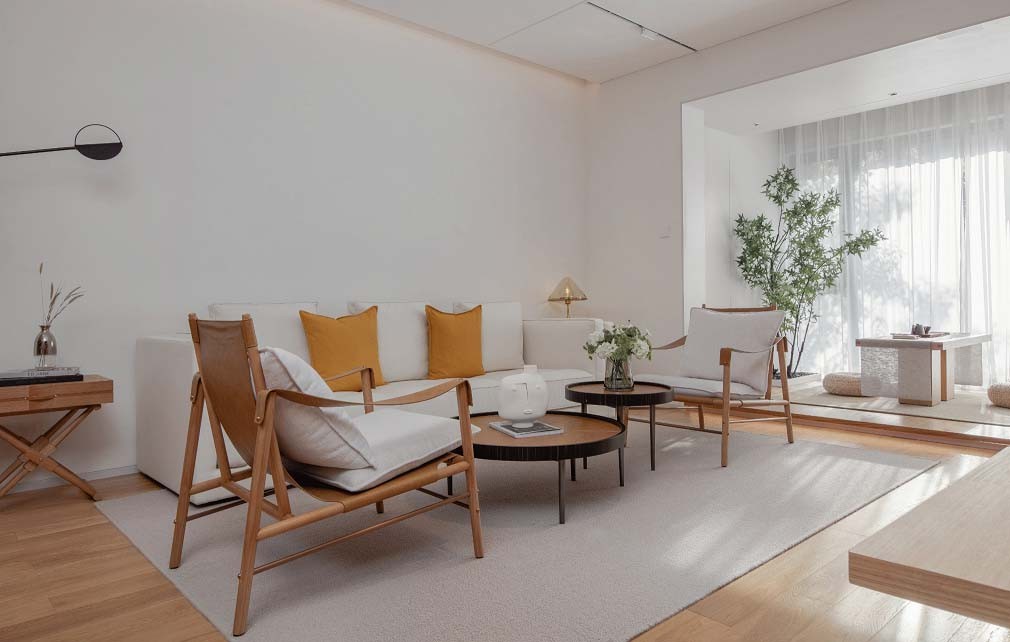 木材是沉睡的阳光,阳台向内留出一处空间,将阳光“储存”,使户型得以“呼吸”,茶室的置入让功能更为多元,白色透光窗帘搭配浅调木作以及棉麻家具,给室内带来闲适而清新的空间氛围,纯度较高的橙色靠垫则将城市的摩登和现代性引入了室内,活泼而不失调性。