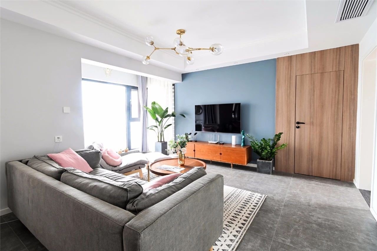 电视背景墙刷上蓝色的乳胶漆,安静又***,搭配木质的电视柜,周围还有不少绿植装饰,这样的客厅很安静,很放松。