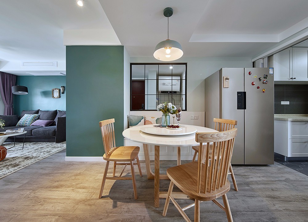 餐桌旁边的蓝绿色墙是给孩子们准备的黑板涂鸦墙。右侧是那面45度的斜体墙面。餐桌尺寸为1.1米。椅子右侧***过人通道尺寸为1.3米