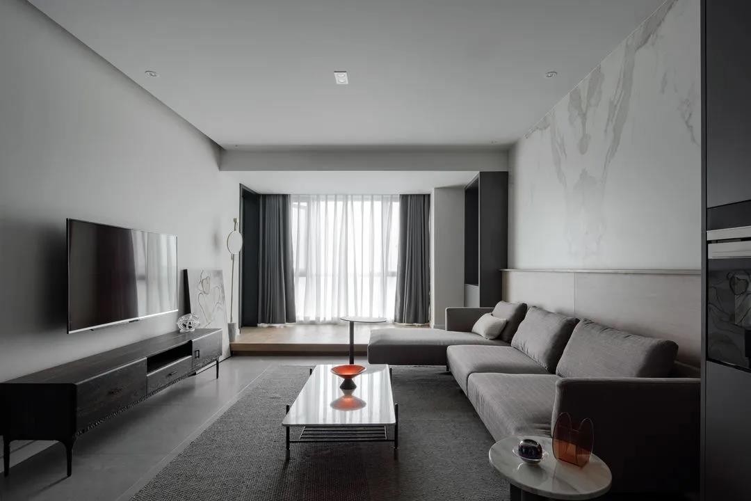 客厅天花以吊平顶的设计,电视墙浅灰色的洁净墙面+深木色电视柜组合,沙发墙是岩板材质+灰色布艺沙发,整个客厅铺上灰色地毯,在灰白配的硬装与软装搭配下,呈现出一种朴素从简的现代空间感。