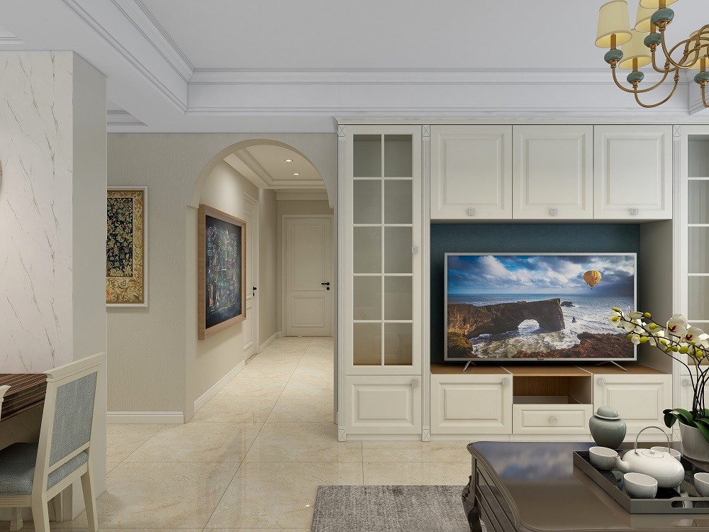 客厅的地砖是暖色系的瓷砖,蓝的和黄铜色相呼应的美式吊灯让整个空间变得端庄优雅,温柔可人。