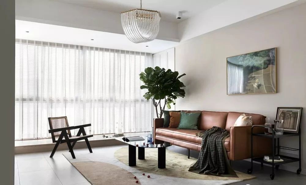 客厅干净素雅,没有一丝冗余,简洁又不失格调。大面积落地窗,提供充足的光线和宽阔的空间感。电视墙与休闲区的展示柜做了双面设计结合,视觉上整体性更强。