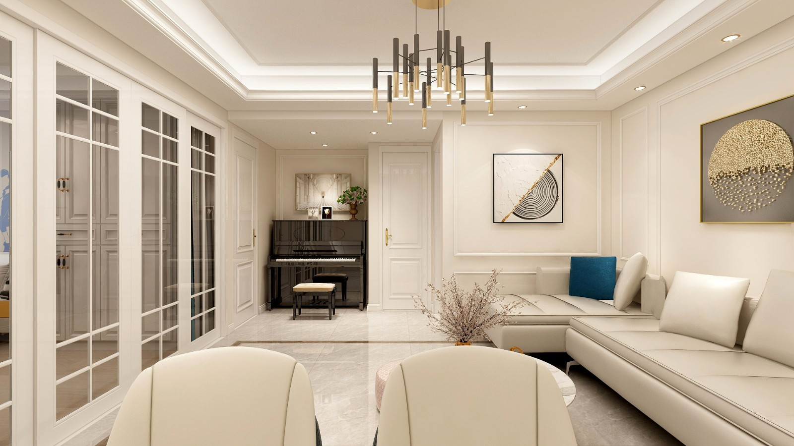 漫步踏入客厅,在细节中做加法,兼顾优雅的格调、高贵的品质和中西融合的风格;采用柔和而优雅的色系,带给人平和自持、舒缓雅致的情绪,点缀丰富的纹理和艺术品,形成丰富美感的同时,更是走在奢华气场与优雅风度之间。