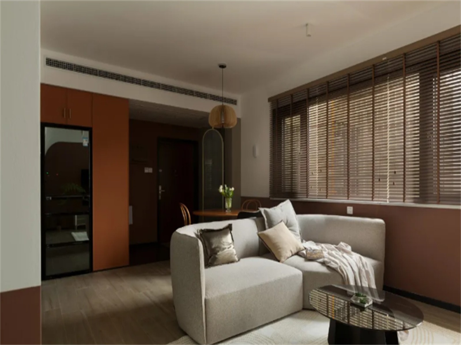 客厅,整体以大地红为基调,搭配自然的原木地板,花灰色主沙发的尺寸和造型弧度在这个空间中恰到好处,木百叶过滤西晒太阳透过木质缝隙,将氛围感直接拉满