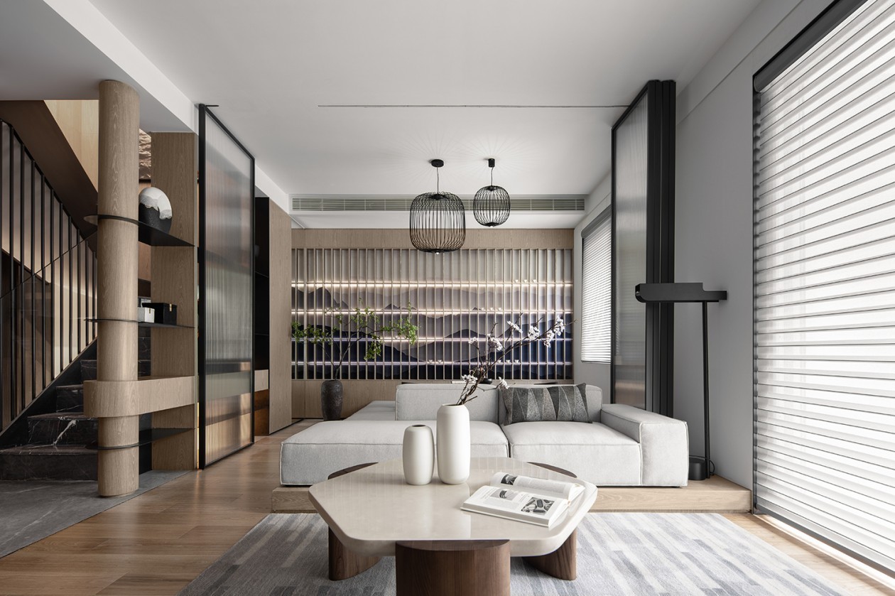 以折叠拉门作为客厅与茶室的动态分割,延伸了客厅的轴线,也让整体空间在视觉上给人更宽敞的感受。