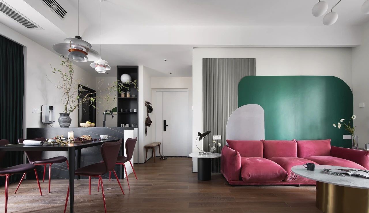 红绿色块带来强烈的视觉冲击感,融合金属家具的质感,热烈与克制并存,体现屋主的个性,赋予空间独特魅力。