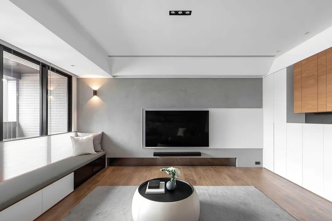 定制柜实用且美观,一家人其乐融融的窝在沙发上看电影,同时完美的解决了家里收纳的问题。搭配圆墩的木茶几 ,简约又蕴藏丰富的层次美。