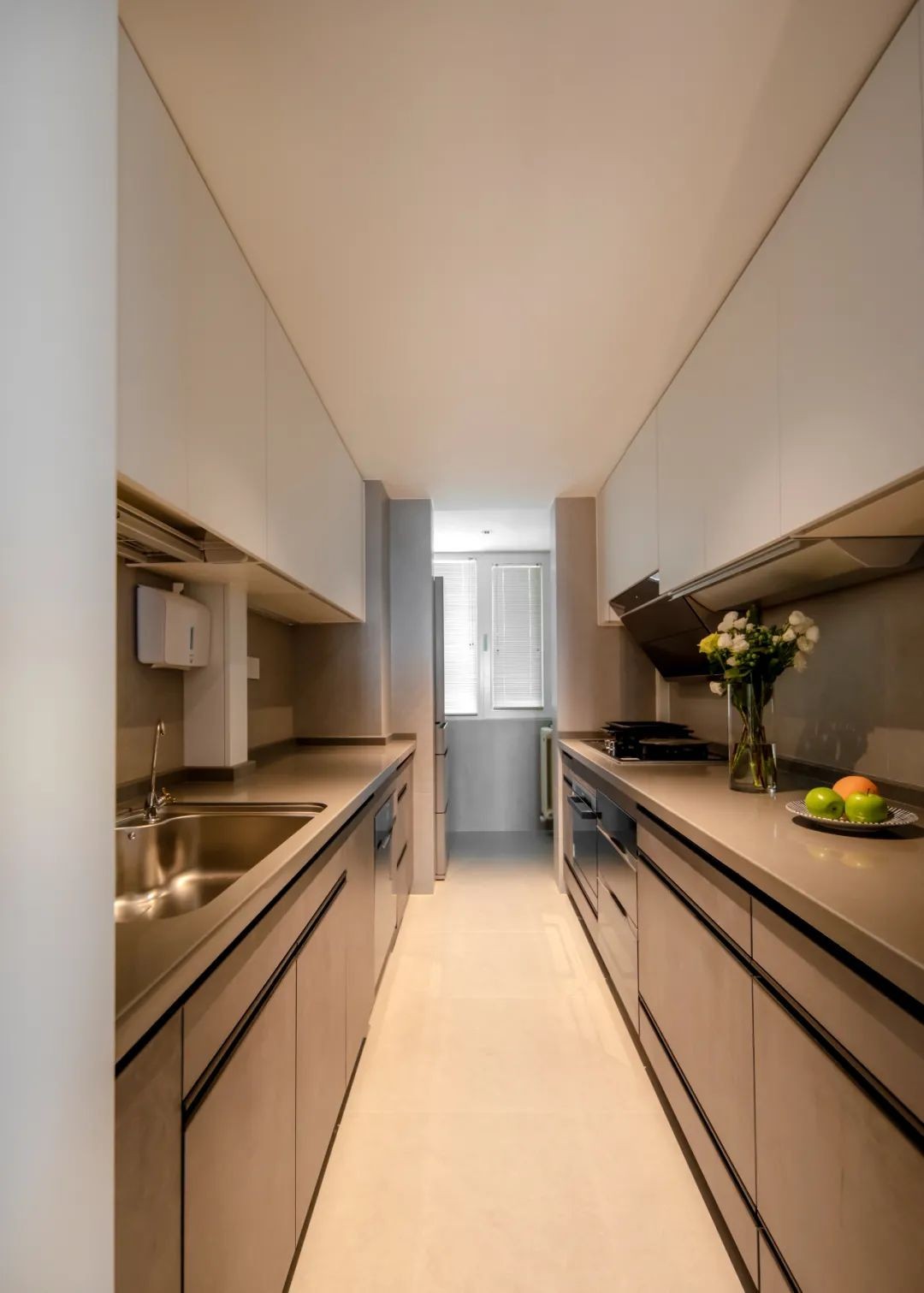 双一字型布局与现有的厨房条件更契合,从左到右,依次可做到洗、切、煎、炒等操作,动线流畅。厨房的一端连接小阳台,让厨房的采光更通透。