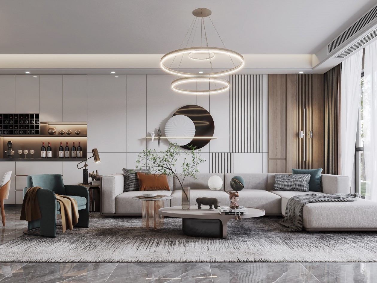 以极简手法,利用线条之美,融合轻奢材质,塑造出一个宁静舒适的居住空间。金属元素与皮革材质的局部使用,使得时尚感跃然而上。