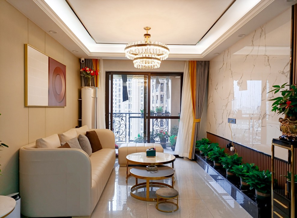 初见郭小姐是在劳动节,业主从事医美行业,对美有自己独特的见解,希望未来的家可以像样板间一样充满质感,喜欢金色华丽和水晶的莹亮,同时又不希望跟样板间一样规矩和常规。本户型较为方正,但是总体面积不大,需要合理布局,提高收纳利用率,其次卫生间采光有限。经过设计师的合理布局,整体呈现两室两厅1卫的布局,注重收纳理念,将阳台打造收纳型阳台,洗手收纳组合型的布局可用来收纳洗衣机。