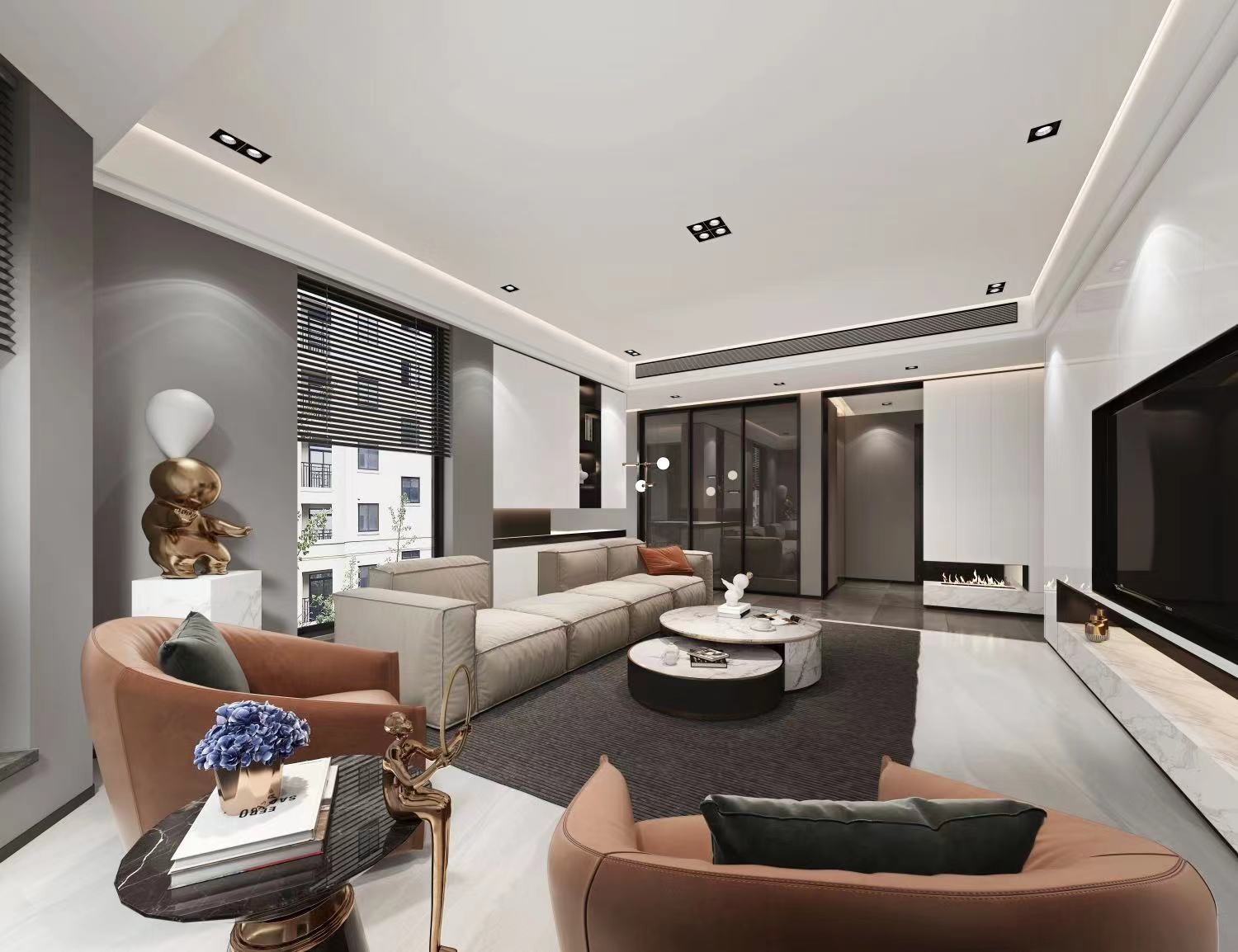 承袭着样板间的脉络,将现代/ 简单/ 纯粹/ 人文/ 生活等元素用更大的建筑语汇去执行整个平层空间,用机能化的柜体创造室内建筑般的量体、轴线等概念。空间中采用简单纯粹的线条勾勒空间量体,并赋予材料新的意义,地坪石材切割重组,型塑如同泼墨画般的视觉效果。 金属手刷铜、铁件、木皮与石材、以现代手法与语汇、以及细腻的细部介入空间,赋予风格鲜明的时代感。
