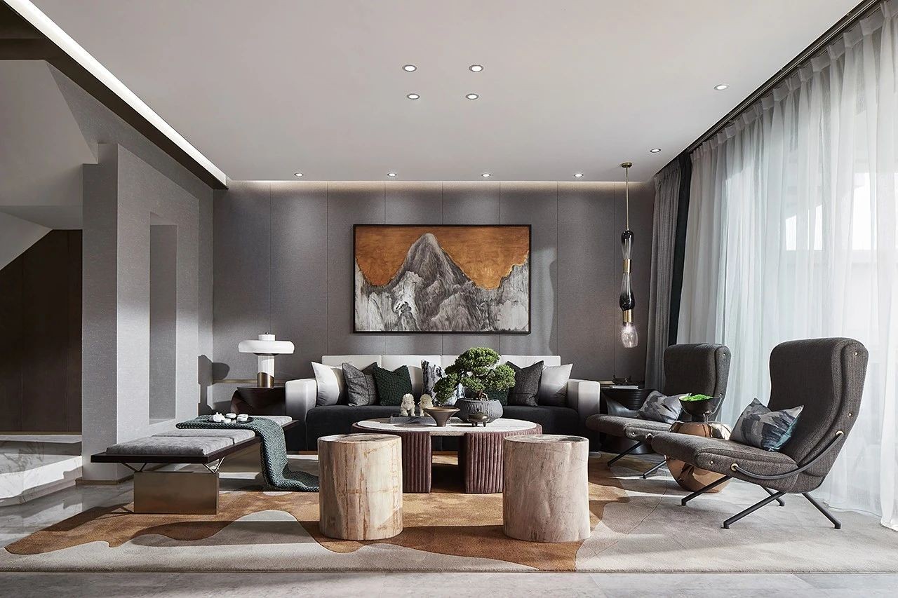 客厅区域以灰调为主,呈现出简约的时尚品格,灰色毛绒布艺沙发使用感极其舒适,立式台灯在夜晚使用,为清冷环境增添一丝温馨氛围。