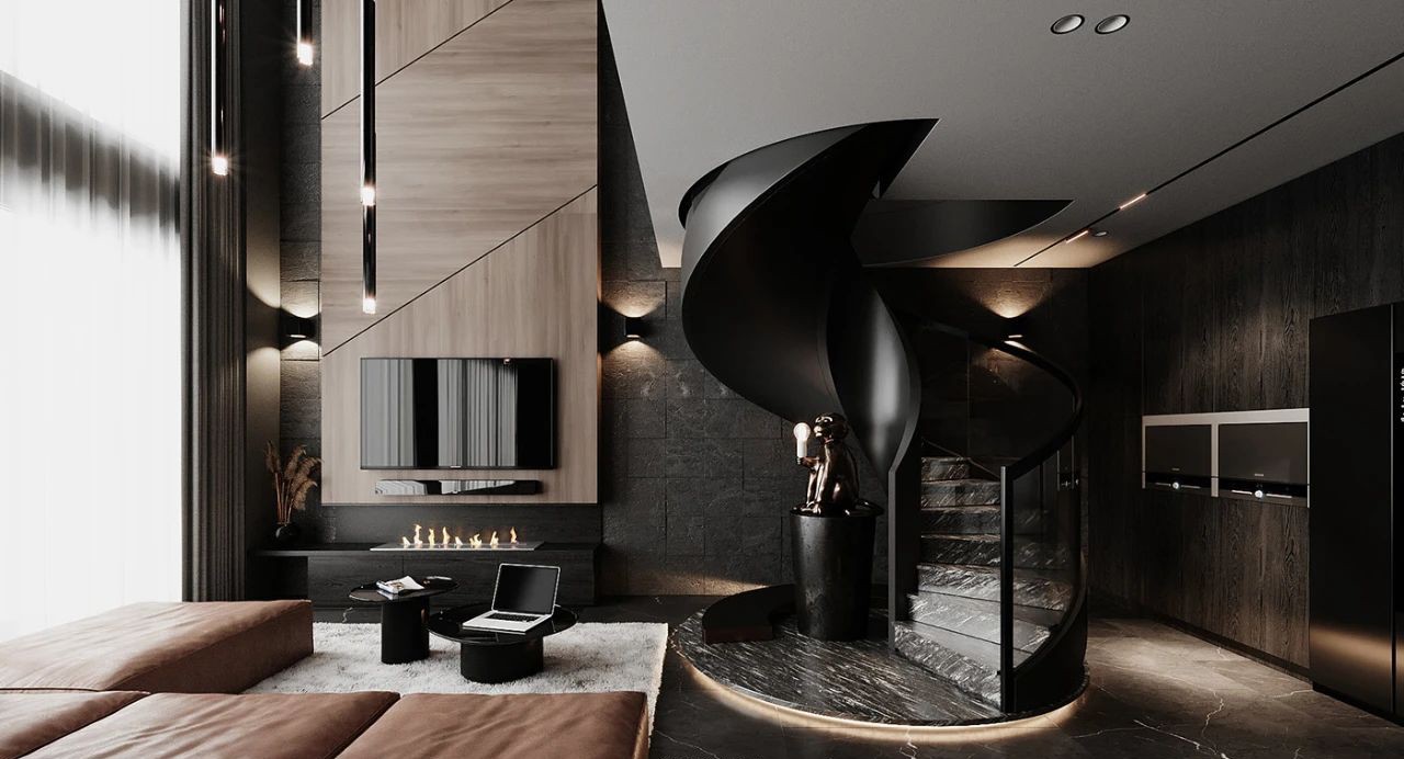 作为整体设计中的***亮点,客厅正中间黑色的旋转楼梯是最吸睛的一个部分