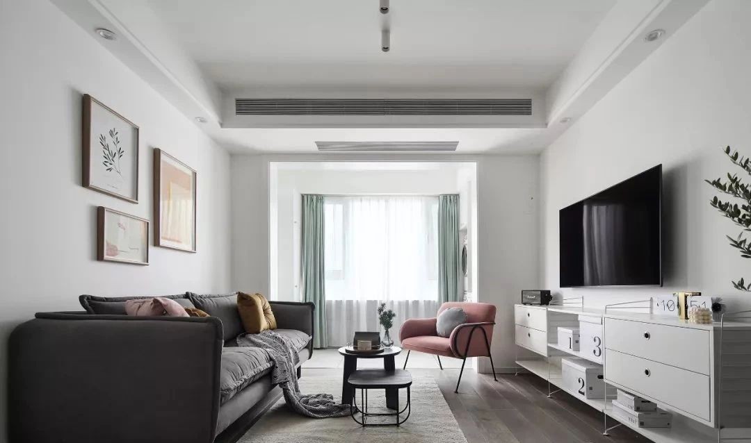 客厅,整体涂刷大白墙,各种色彩的家具、软装点缀其间,不会显得太过单调。