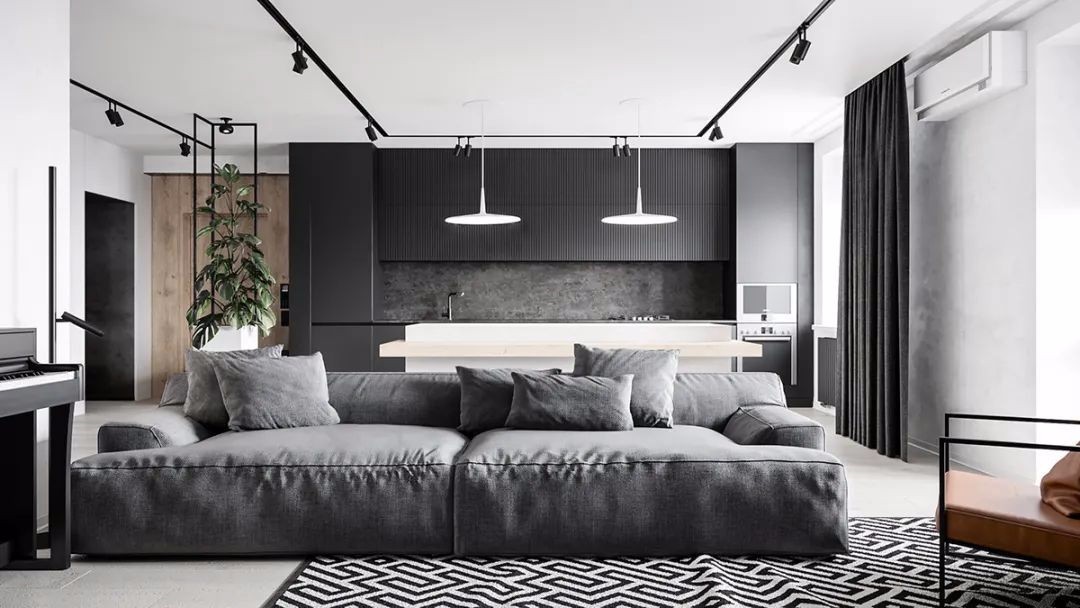 客厅设计简约大方,整体色调为黑白灰,配有木色点缀