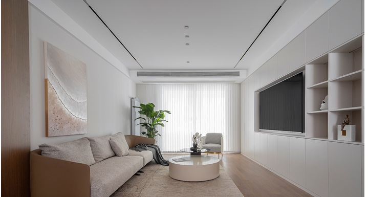 汝窑色墙面,搭配原木与咖色,让简洁有力的客厅更显轻盈通透。 无主灯设计,用内嵌筒灯+磁吸轨道灯作为照明,不仅保留了原始层高,也保持了天花板的简洁。